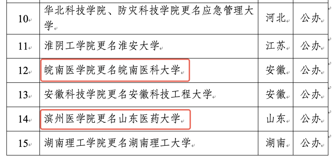 昨日,教育部官网发布《关于拟同意设置本科高等学校的公示》,其中,拟同意皖南医学院更名皖南医科大学、滨州医学院更名山东医药大学。